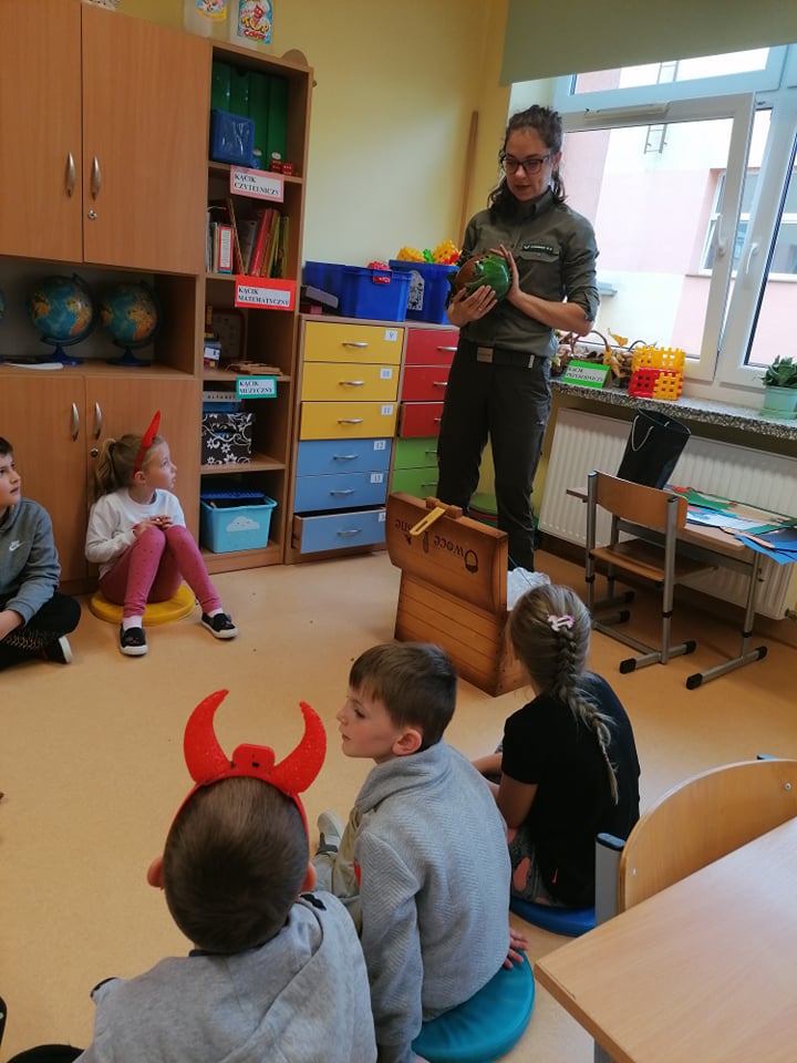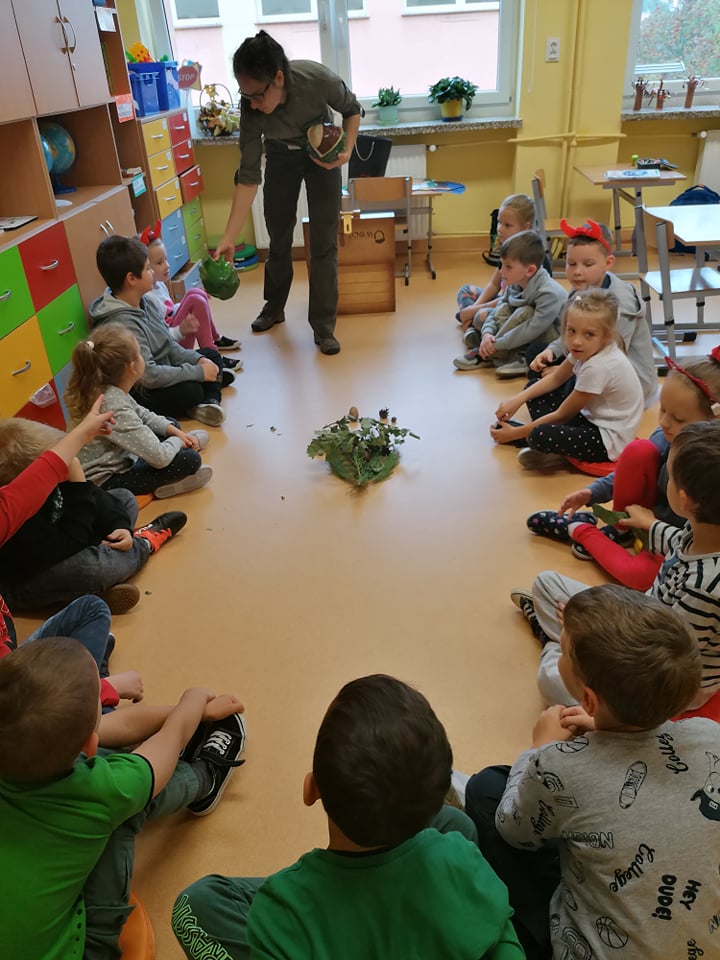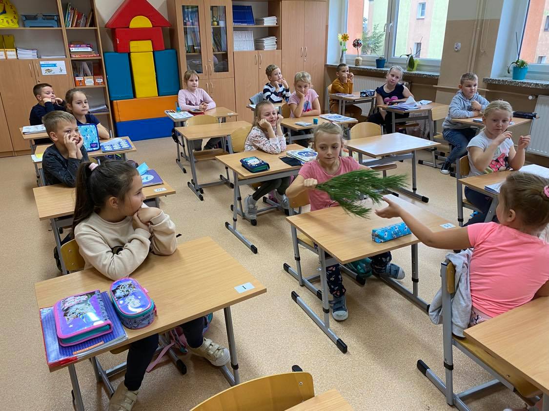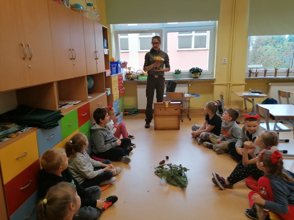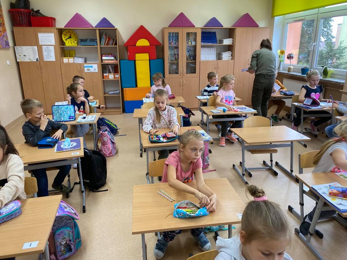07.10.2021r. uczniowie klas pierwszych wzięli udział w spotkaniu z leśnikiem z Nadleśnictwa Mirosławiec, panią Małgorzatą Butkiewicz. Celem spotkania było zapoznanie dzieci z pracą leśnika. Nasz gość opowiedział dzieciom o zwierzętach mieszkających w lesie, o przygotowaniach zwierzyny leśnej do zimy, a także o zachowaniu się w sytuacji zetknięcia się z leśnymi zwierzętami. Pani leśnik opowiedziała również o sadzeniu lasu, opowiedziała o roślinności występującej w lesie. Przypomniała, jak należy zachowywać się w lesie i jakie grzyby można zbierać. Dzieci miały możliwość obejrzenia okazów naturalnych roślin, jak również drewnianych modeli grzybów i okazów przyrodniczych. Uczniowie z dużym zainteresowaniem słuchali tych opowieści, a na zakończenie spotkania otrzymali książeczki o lesie do samodzielnego złożenia oraz słodki upominek. Dzieci podziękowały pani leśnik za miłe spotkanie, wręczając własnoręcznie wykonany album ze swoimi pracami.