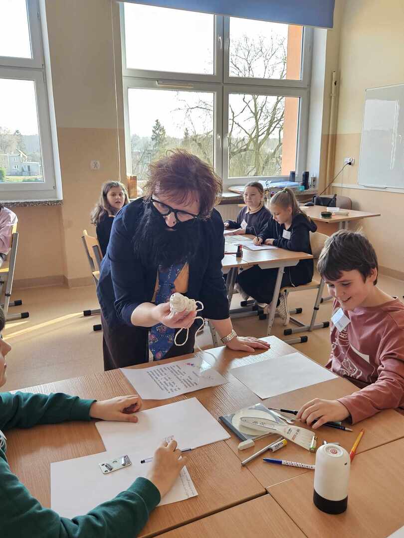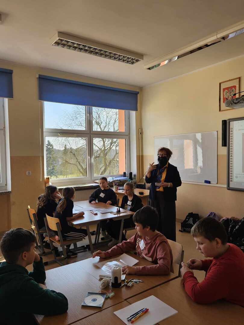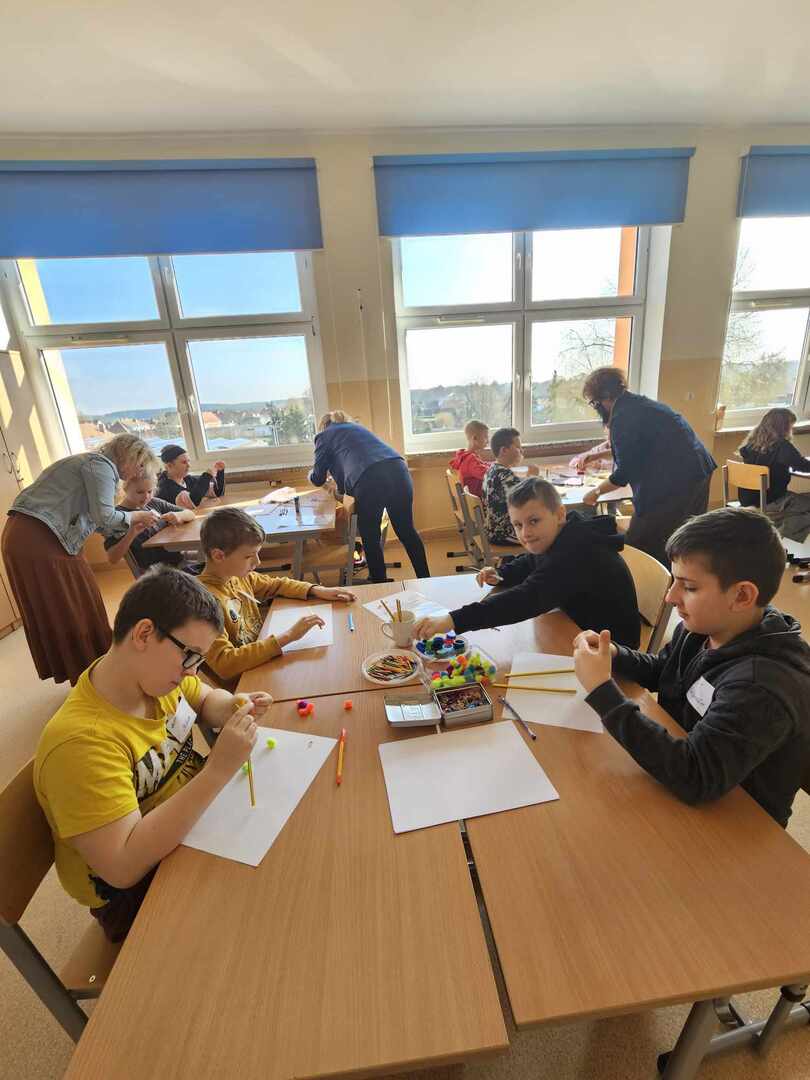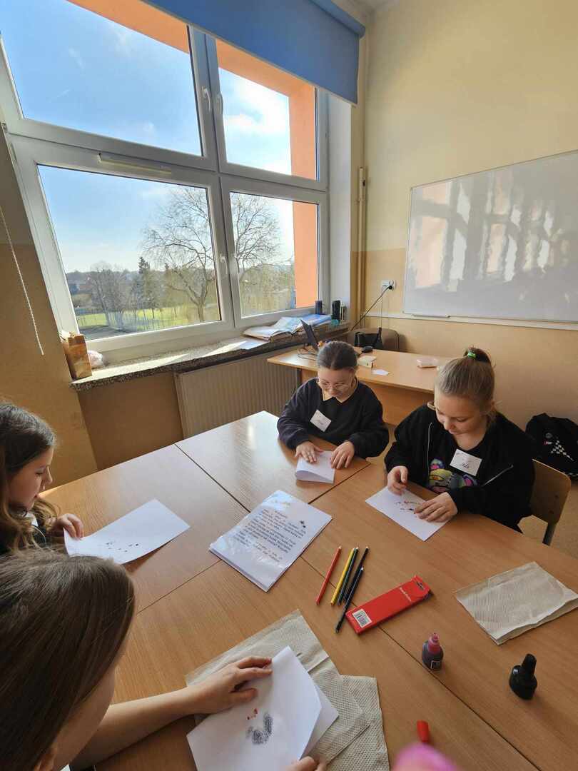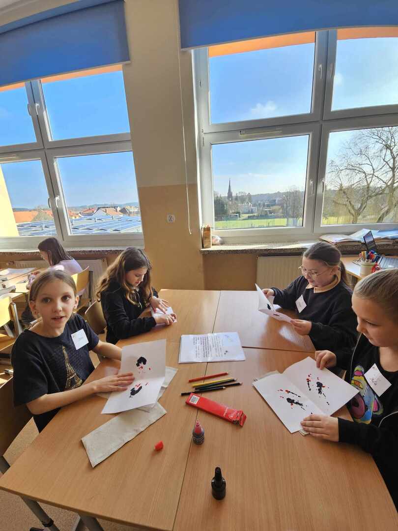29.02.2024 r. naszą szkołę odwiedził pan Kleks. Do swojej Akademii zaprosił klasę IV b. Na początku uczniowie otrzymali nowe imiona, zaczynające się na literę „A”. Nie była to zwyczajna lekcja języka polskiego. Dzieci miały do wykonania nietypowe zadania. Jedną z lekcji w Akademii było przędzenie liter. Czwartoklasiści z uplecionej włóczki musieli ułożyć literę, nakleić ją na kartkę i ułożyć wyrazy rozpoczynające się na nią. Przy zadaniu zatytułowanym „Kleksografia” uczniowie po wykonaniu kilku kleksów na kartce, zginali ją, tak aby kleksy się odbiły, dorysowywali odpowiednie kreski i kropki, nadawali im konkretny kształt i musieli utworzyć rymowankę o tym, co powstało dzięki kleksom. Przy zadaniu „Dania z niezwykłej kuchni” dzieci miały możliwość wcielenia się w pana Kleksai przy pomocy przygotowanych przedmiotów stworzyć własne fantastyczne dania, a następnie podać przepis umożliwiający jego przygotowanie. W „Rupieciarni” znalazło się kilka niezwykłych przedmiotów, z których należało wybrać trzy i opisać, w jaki nadzwyczajny sposób mogłyby być wykorzystane w Akademii. W „Przyszywalni guzików” uczniowie musieli zmierzyć się z zadaniem dokładnego przyszycia guzika, tak aby nie odpadł i nie został zgubiony przez szpaka Mateusza. Wszyscy poradzili sobie z zadaniami znakomicie, dlatego też pan Kleks obiecał, że jeszcze kiedyś odwiedzi naszą szkołę.