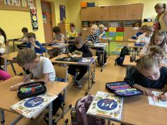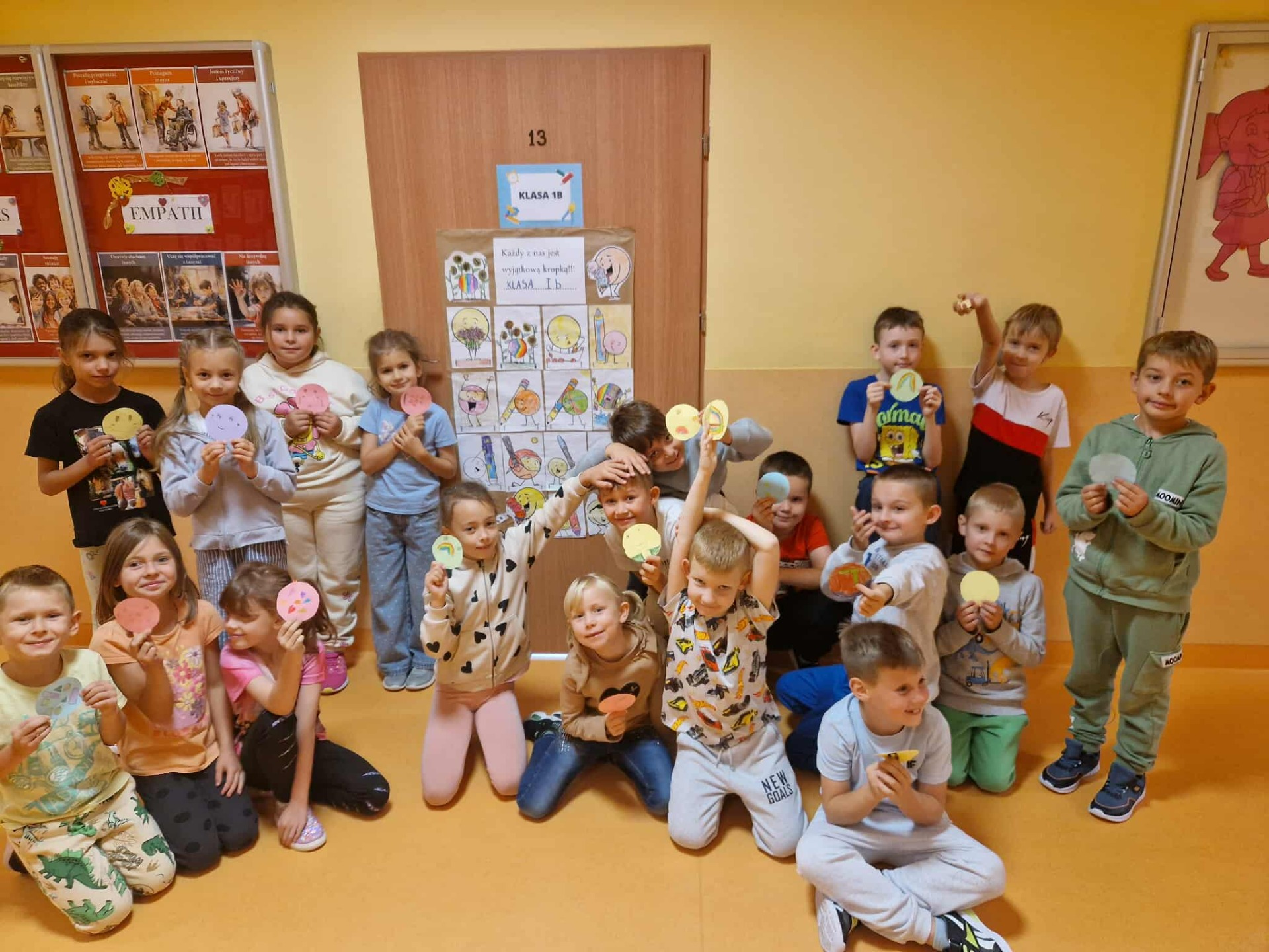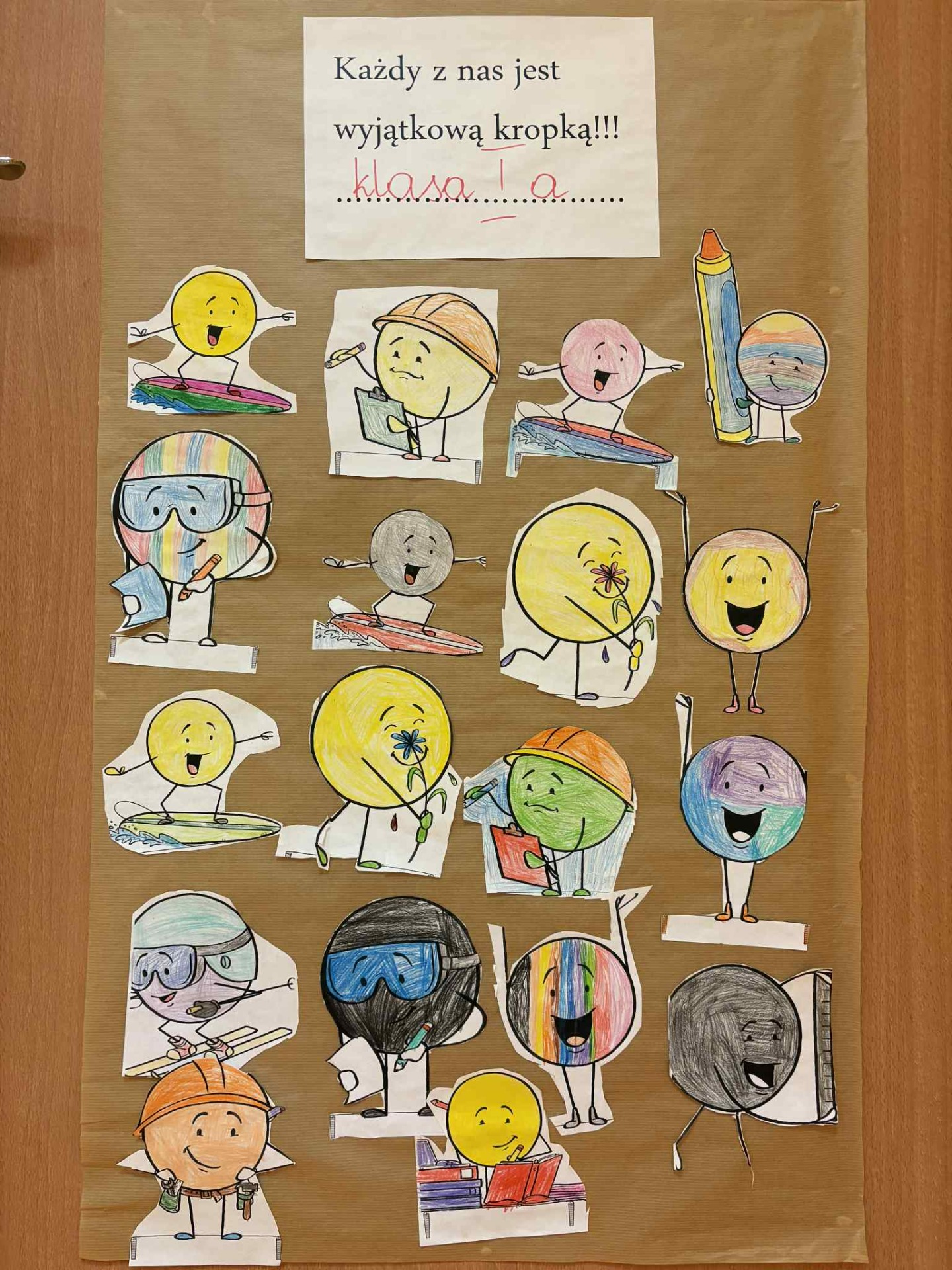Drzwi sal lekcyjnych zostały ozdobione wykonanymi przez dzieci plakatami „Każdy z nas jest wyjątkową kropką” a uczniowie założyli ubrania w kropki.
