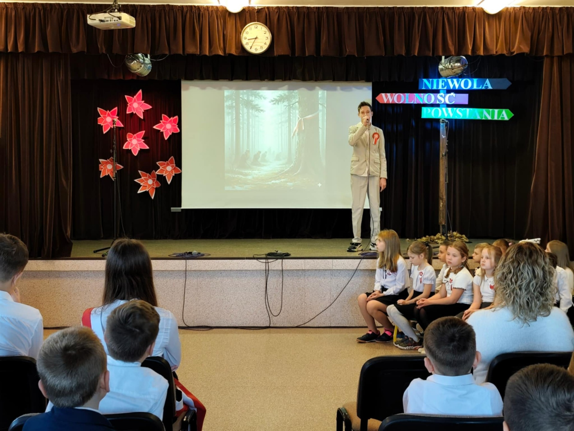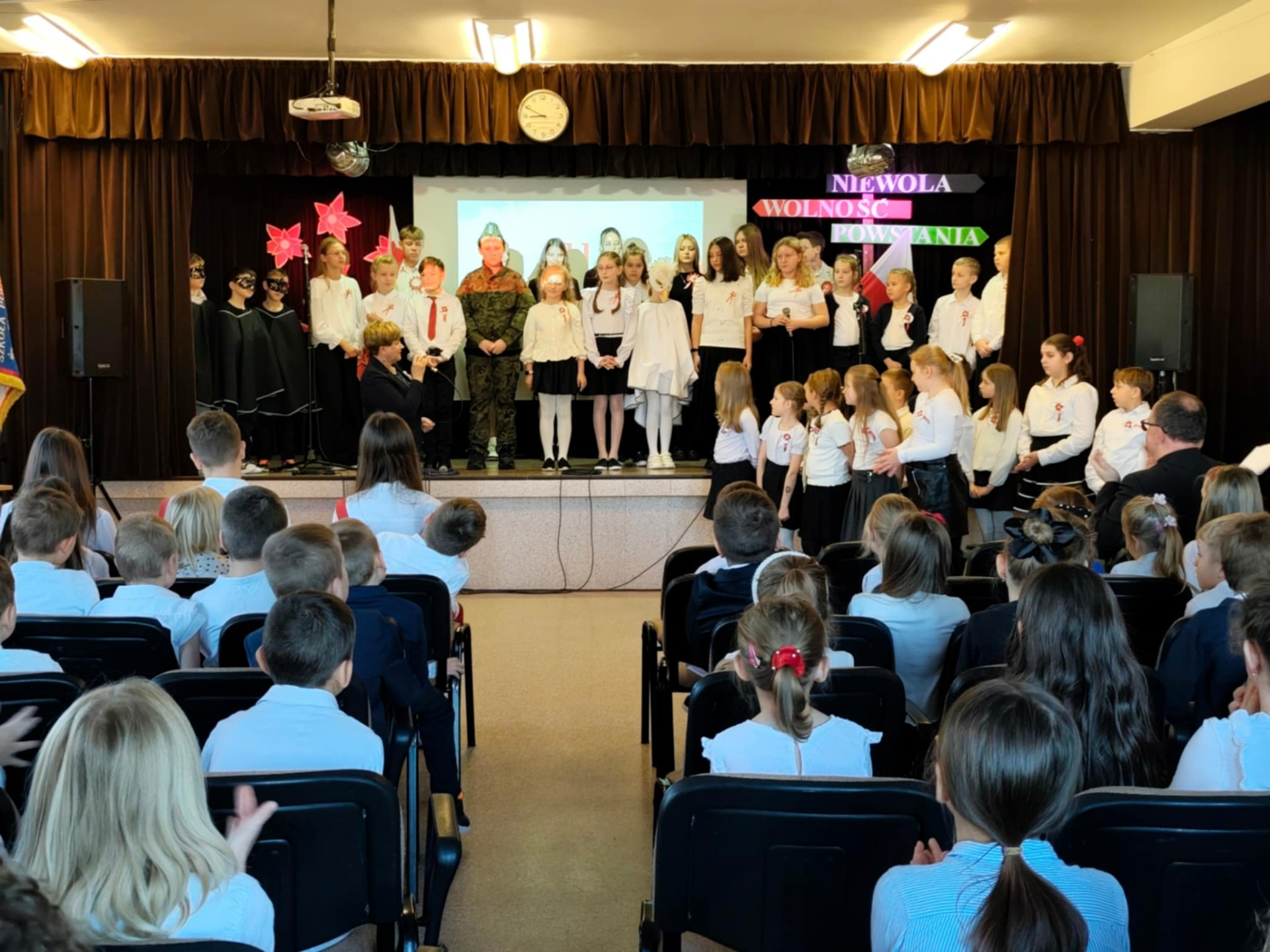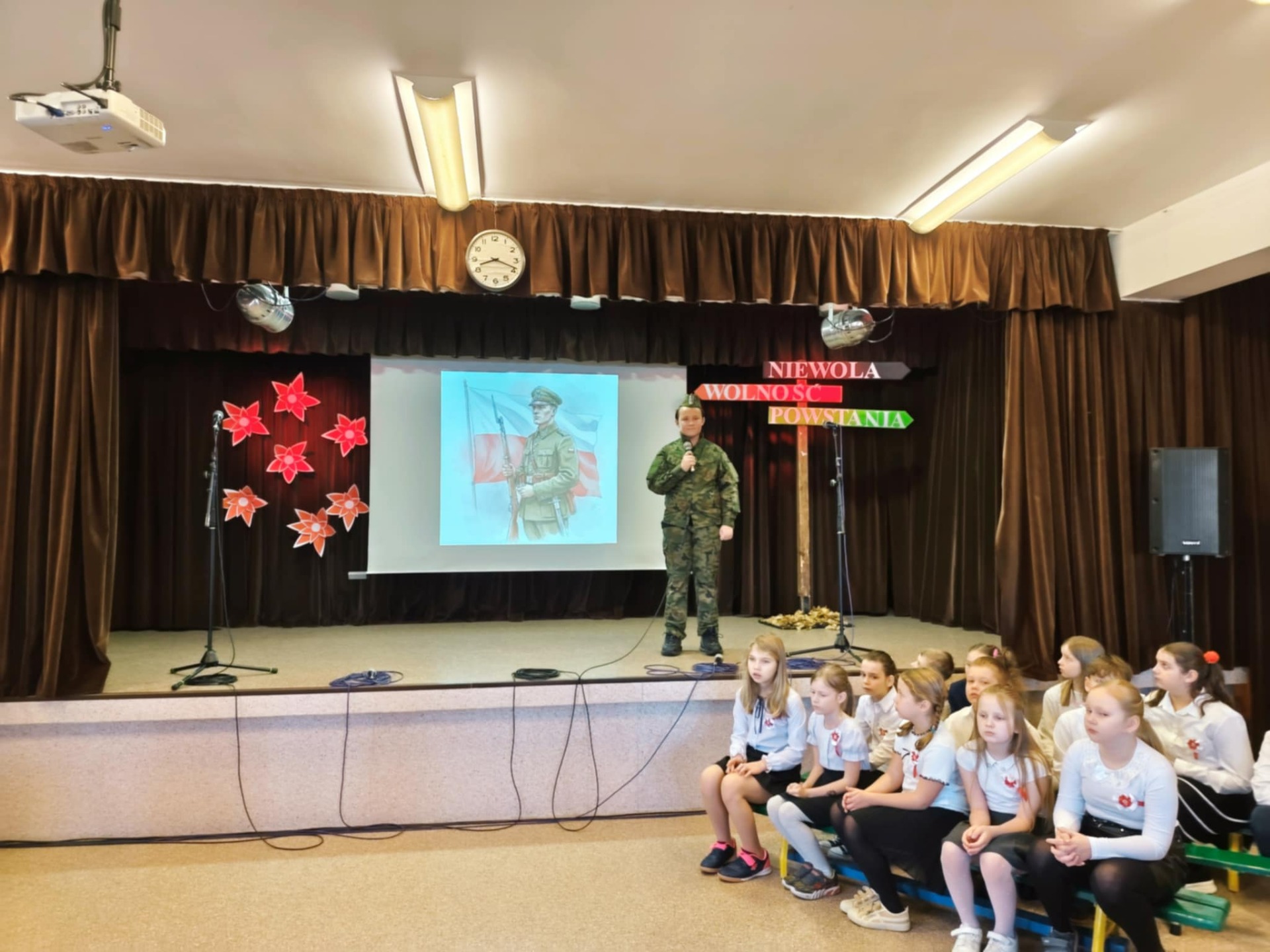 Podczas uroczystości uczniowie przedstawili krótki rys historyczny, przybliżając najważniejsze wydarzenia prowadzące do odzyskania przez Polskę niepodległości w 1918 roku. Narracja została wzbogacona prezentacją multimedialną, fragmentami poezji patriotycznej oraz piosenkami, które wprowadziły podniosły i wzruszający nastrój.