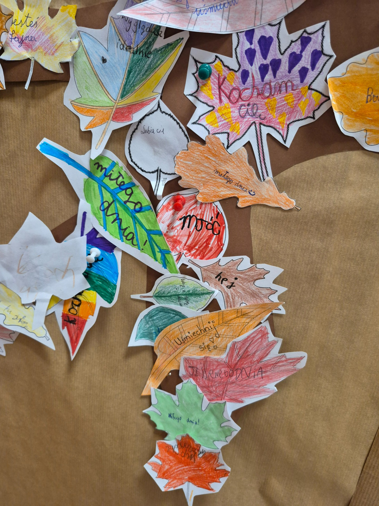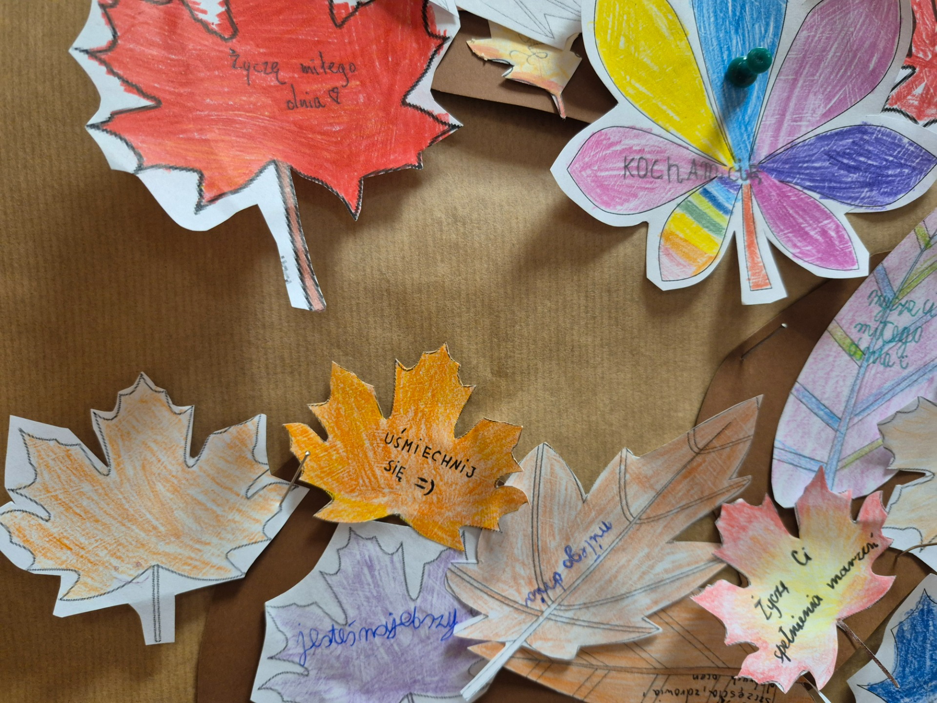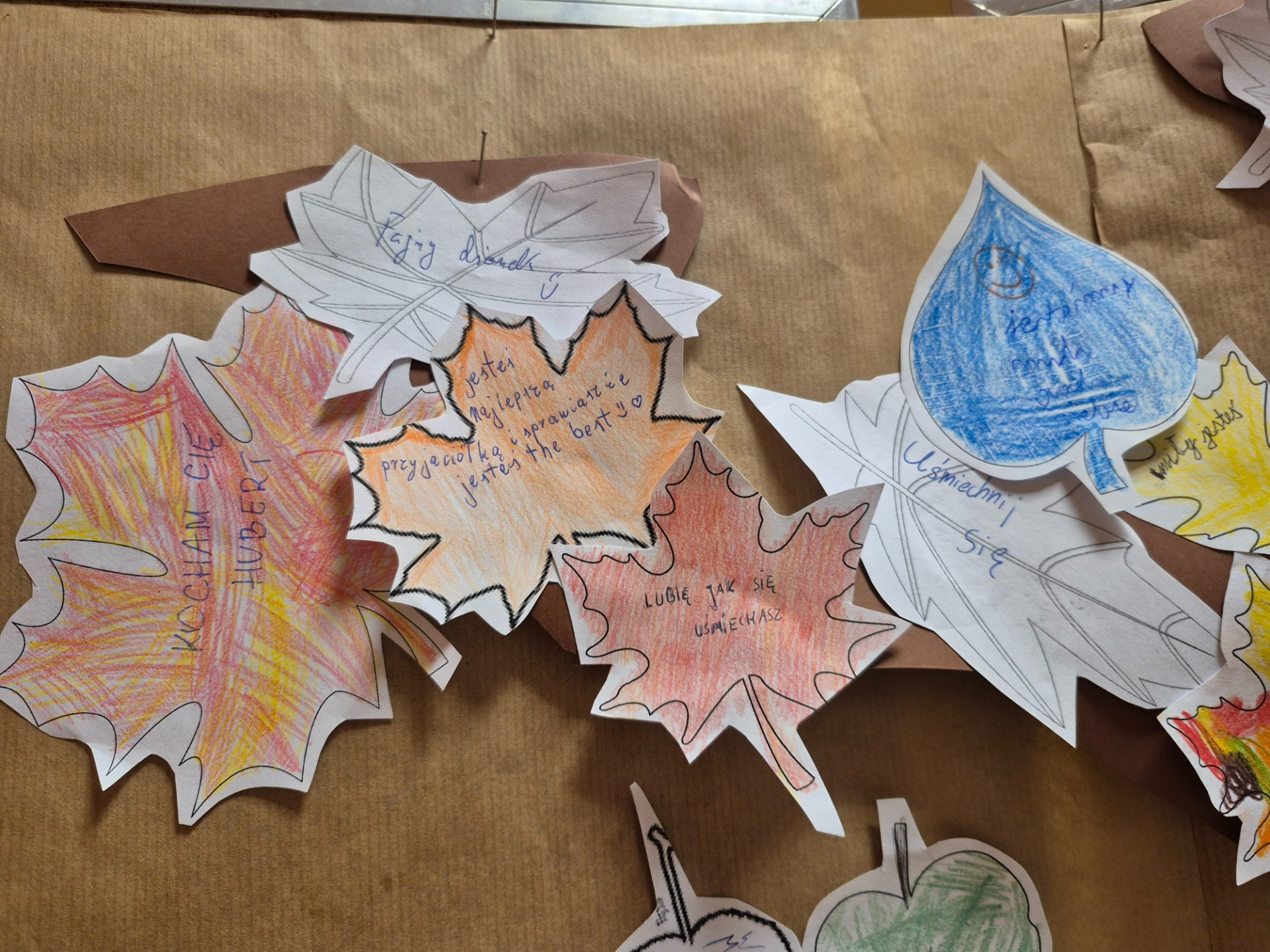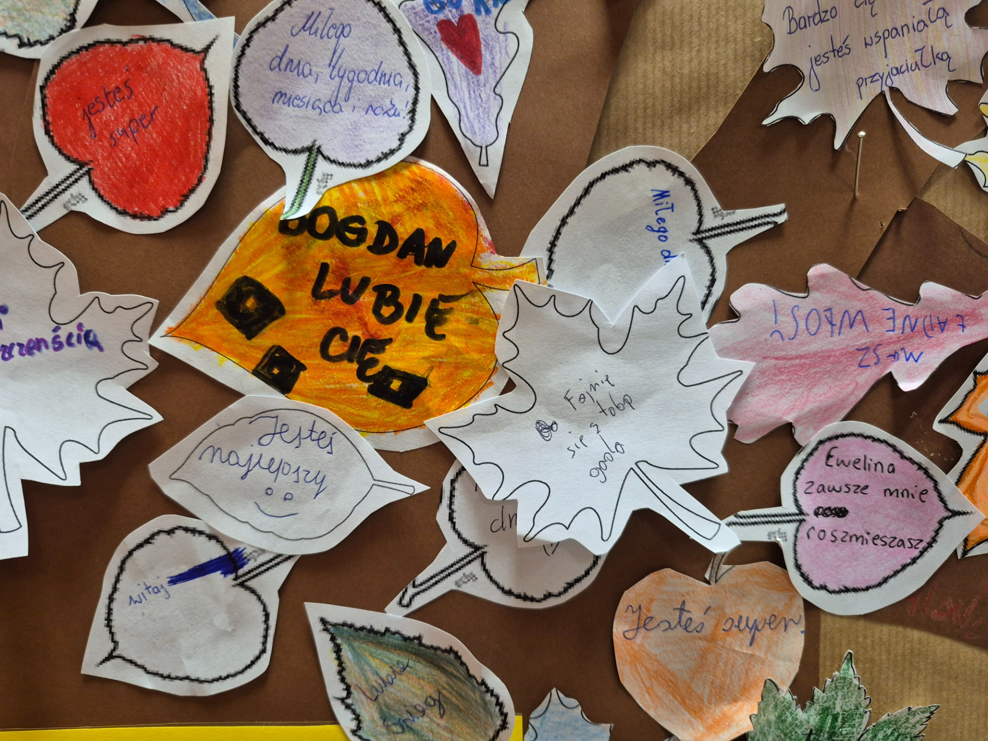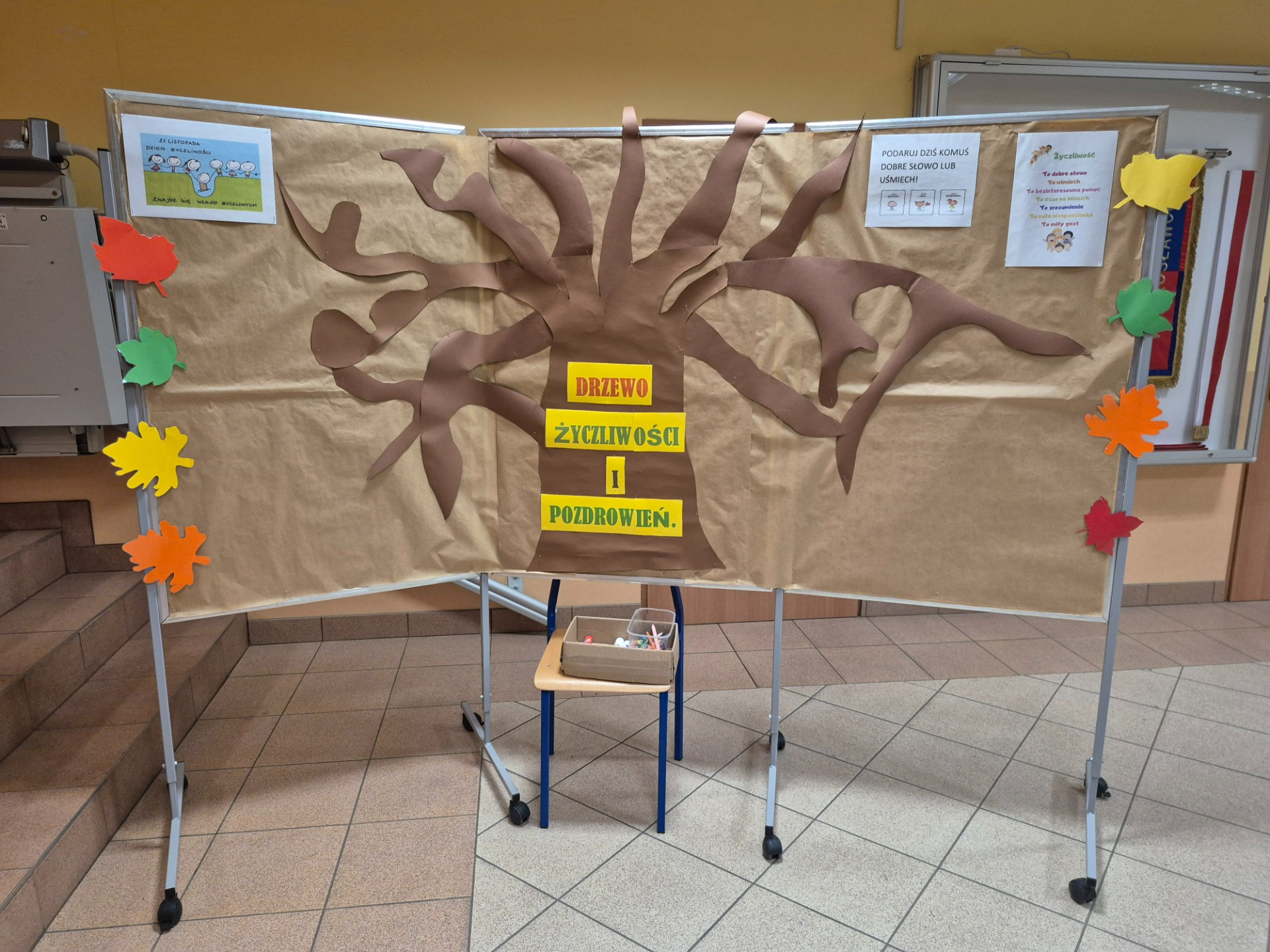 W tym dniu na szkolnym korytarzu pojawiło się Drzewo Życzliwości i Pozdrowień. Uczniowie otrzymali liście, które mogli pokolorować w dowolny sposób, napisać na nich coś miłego- coś co sprawi, że na czyjejś twarzy pojawi się uśmiech. Listek można było podarować komuś innemu lub zawiesić na drzewie, by jak najwięcej osób mogło przeczytać dobre słowo. Na koniec dnia nasze drzewo było piękne nie tylko od kolorów, ale również od pięknych słów.