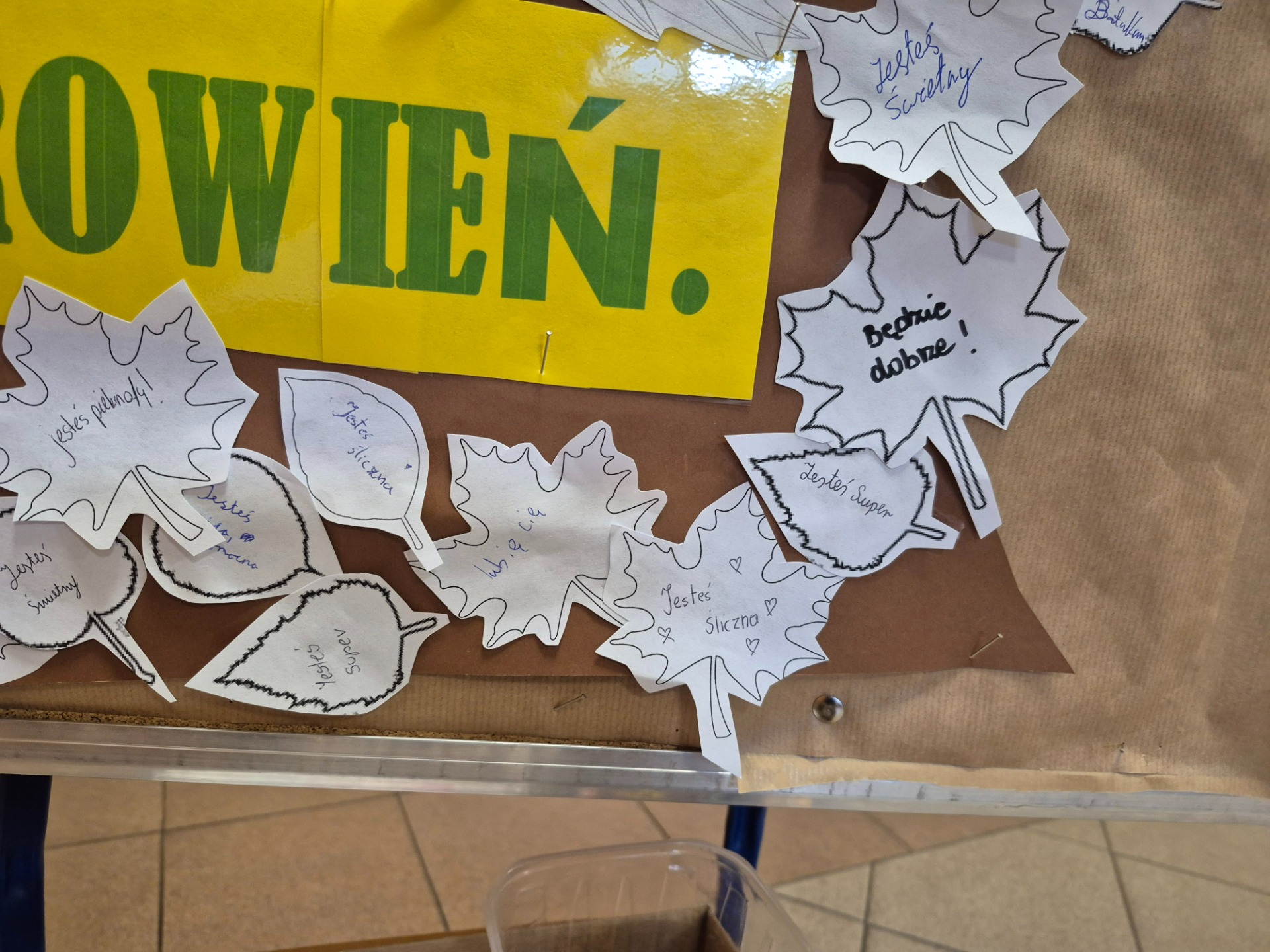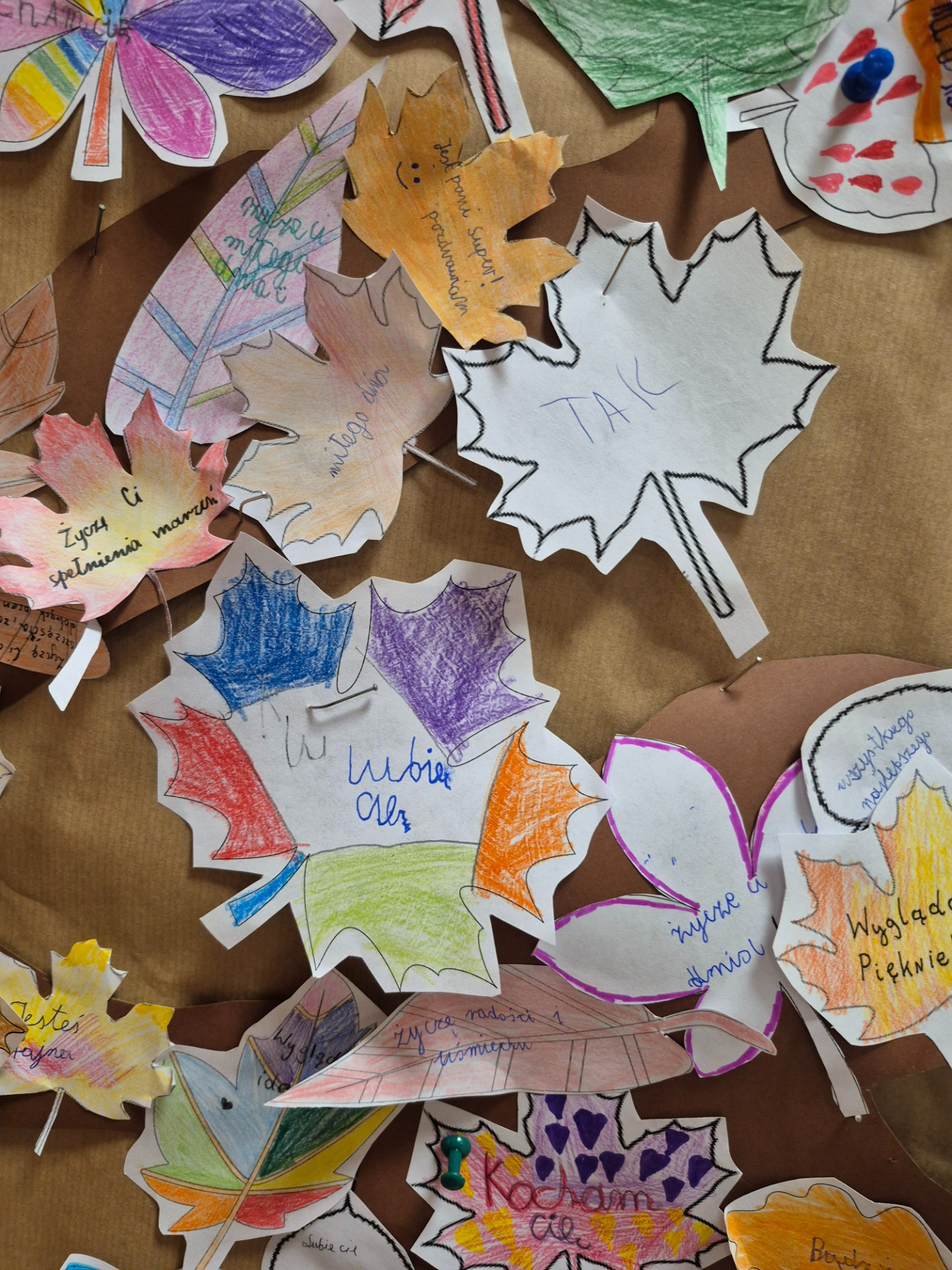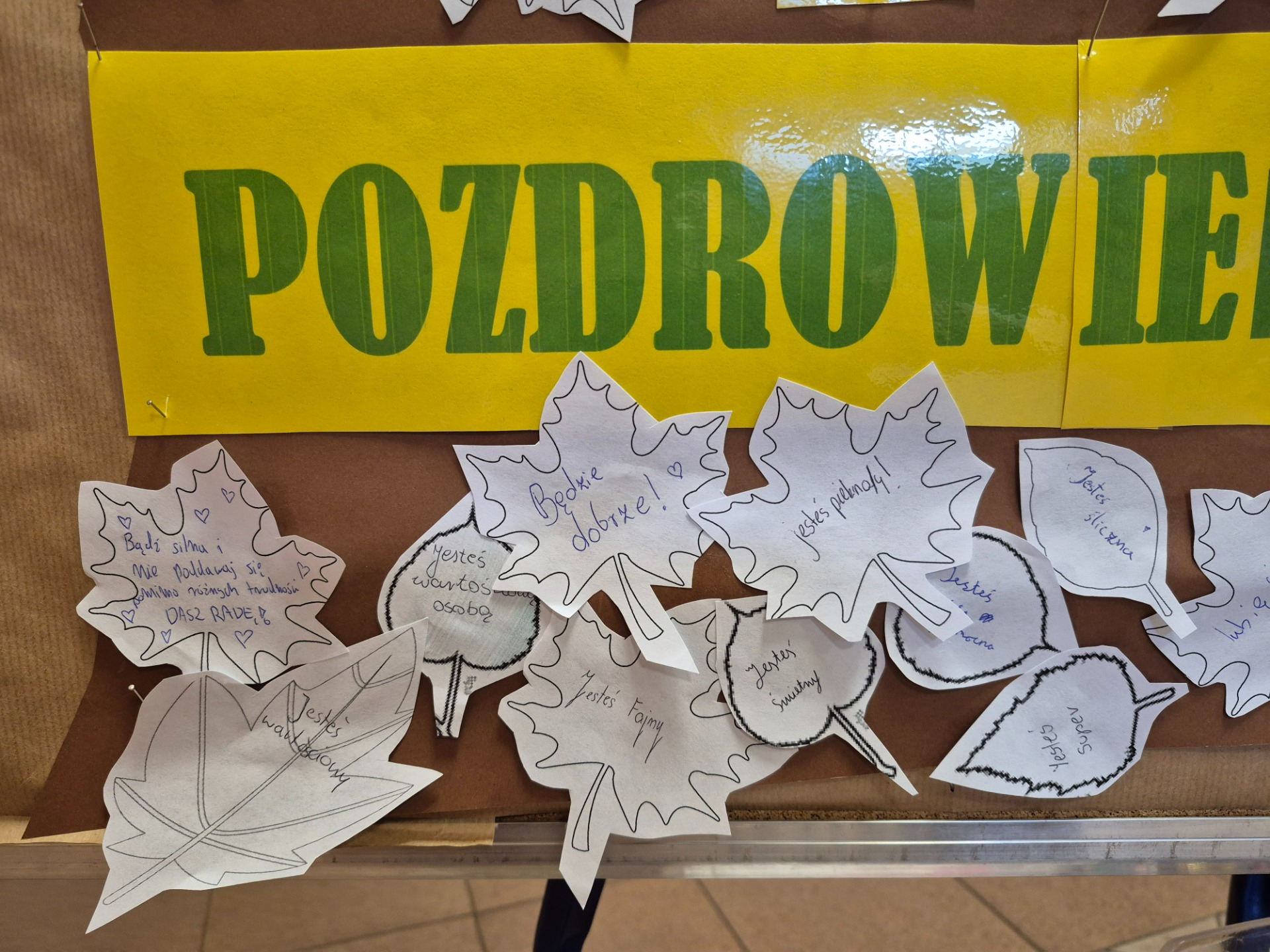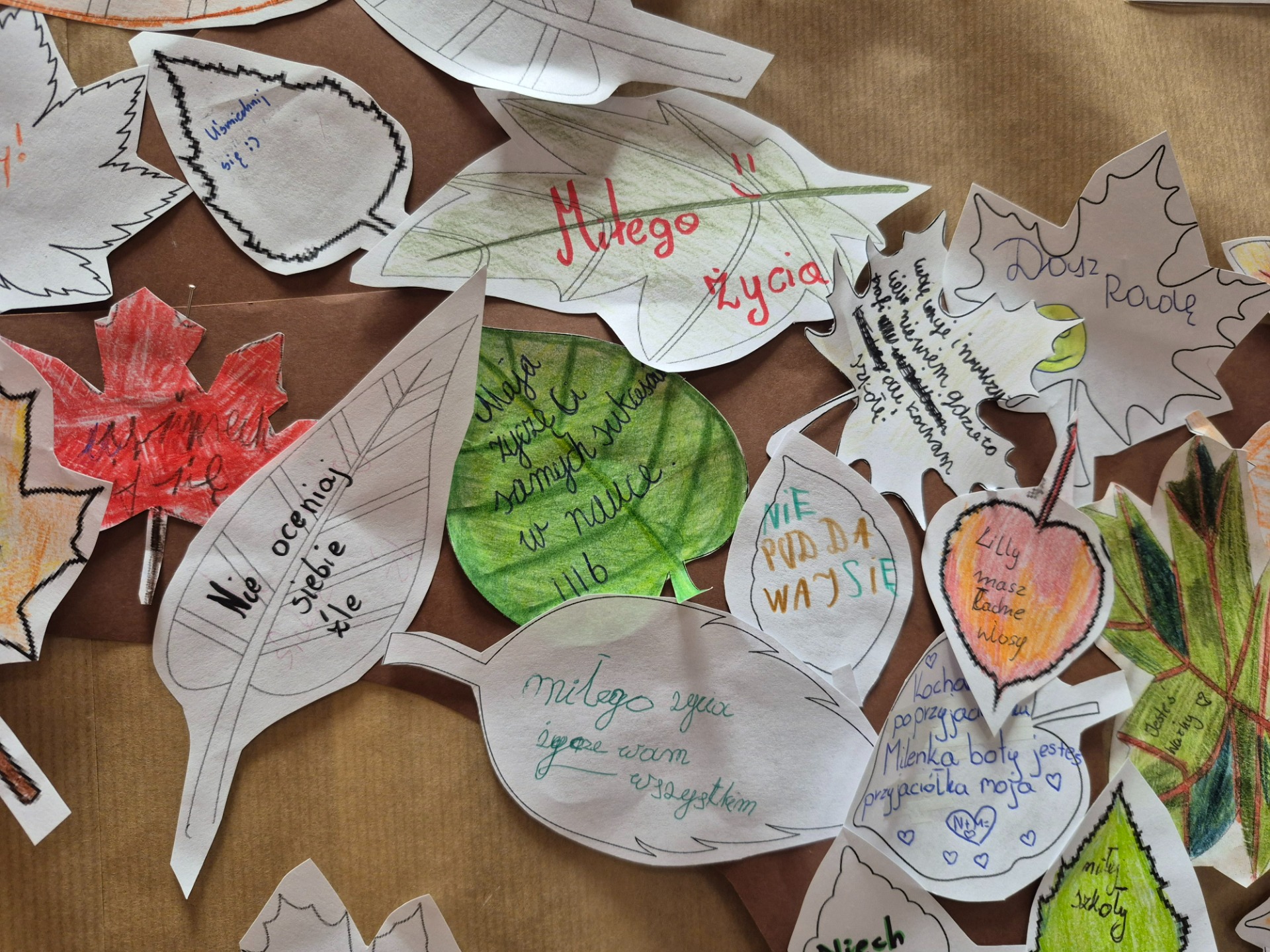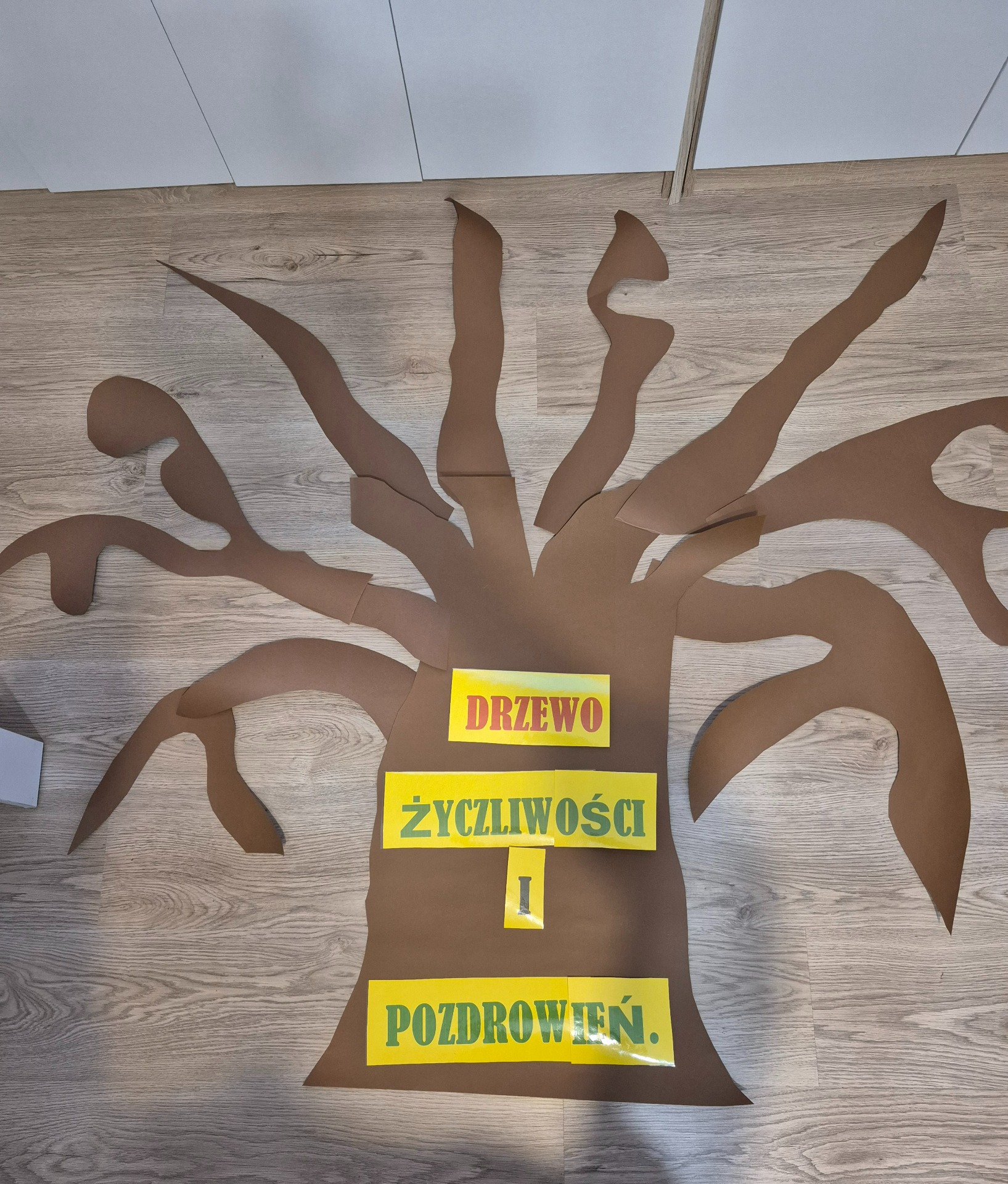 W tym dniu na szkolnym korytarzu pojawiło się Drzewo Życzliwości i Pozdrowień. Uczniowie otrzymali liście, które mogli pokolorować w dowolny sposób, napisać na nich coś miłego- coś co sprawi, że na czyjejś twarzy pojawi się uśmiech. Listek można było podarować komuś innemu lub zawiesić na drzewie, by jak najwięcej osób mogło przeczytać dobre słowo. Na koniec dnia nasze drzewo było piękne nie tylko od kolorów, ale również od pięknych słów.